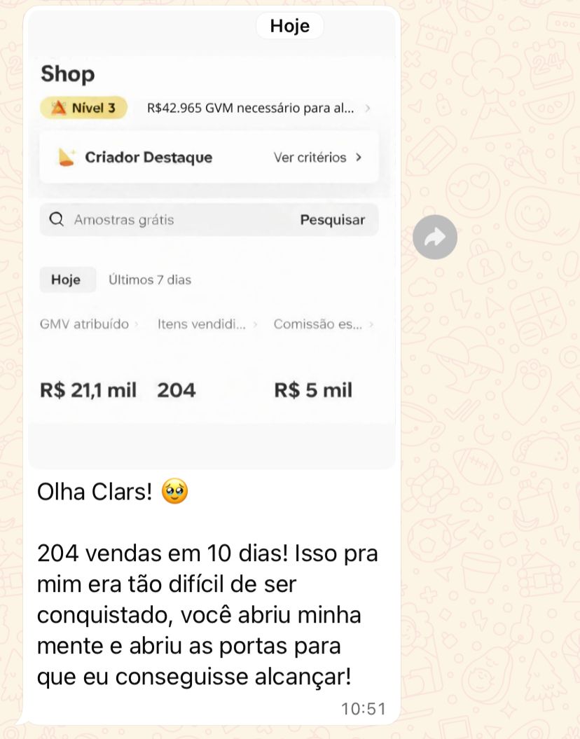 Toda semana, participe de calls com a clara, criadora do Ia creators — junto com membros que já faturaram +R$1 milhão no TikTok Shop e agora ensinam os ângulos, formatos e estratégias para você copiar, colar e viralizar sempre.